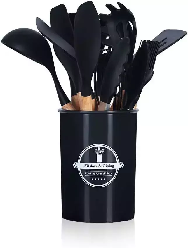 Leve sofisticação e organização para a sua cozinha com o Kit de Utensílios 12 Peças Silicone e Madeira — perfeito para quem ama cozinhar com estilo! ?️?